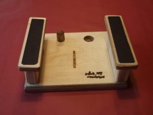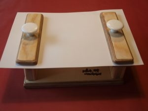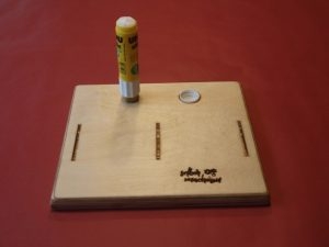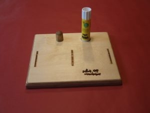 Hier unser Modell dazu: Der Stoppel auf dem Brettchen hälten den Klebestift beim Aufschrauben, die Ausnehmung den Verschluss beim Zuschrauben.